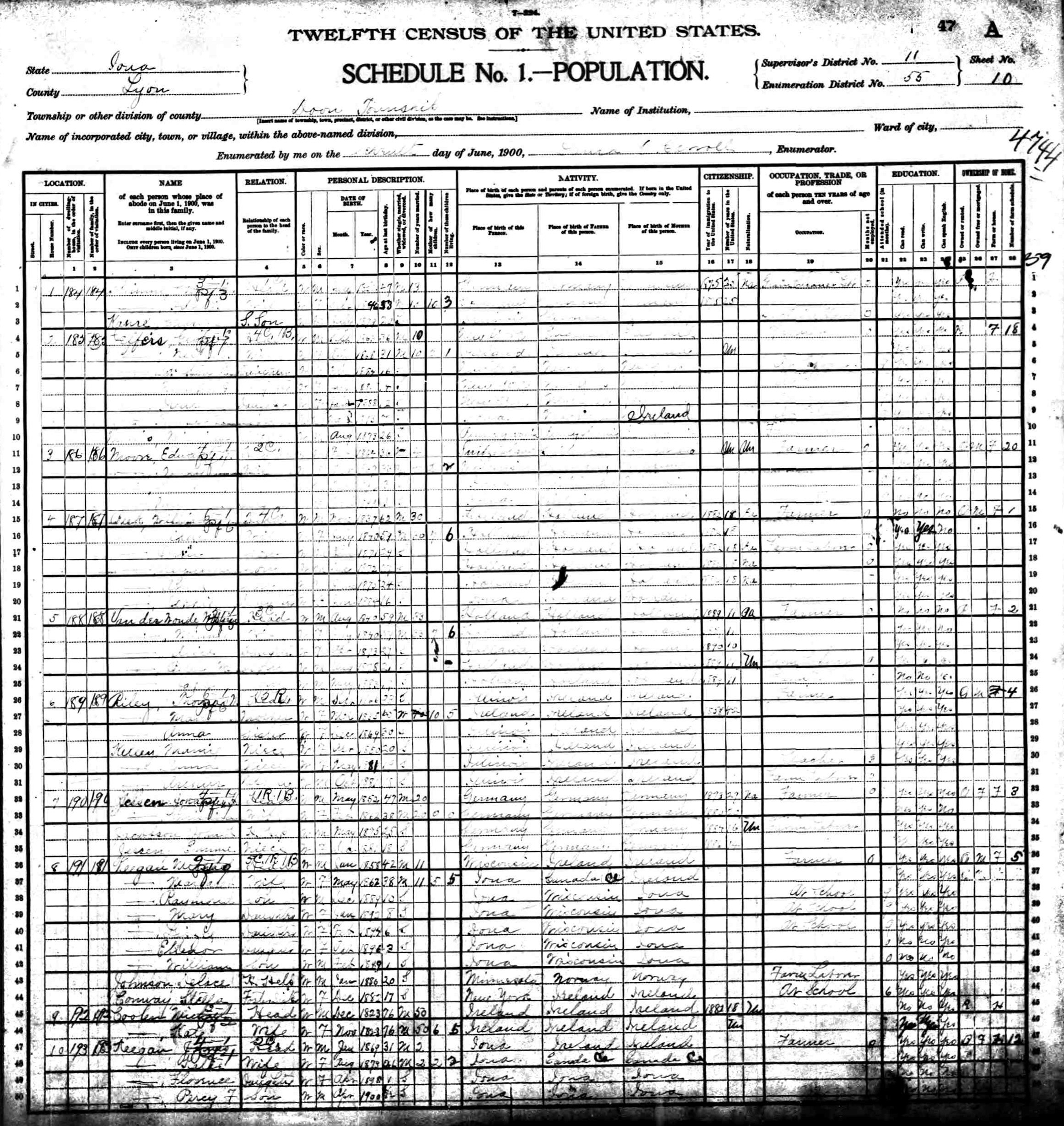 Year: 1900; Census Place: Doon, Lyon, Iowa; Roll: T623 445; Page: 10A; Enumeration District: 55