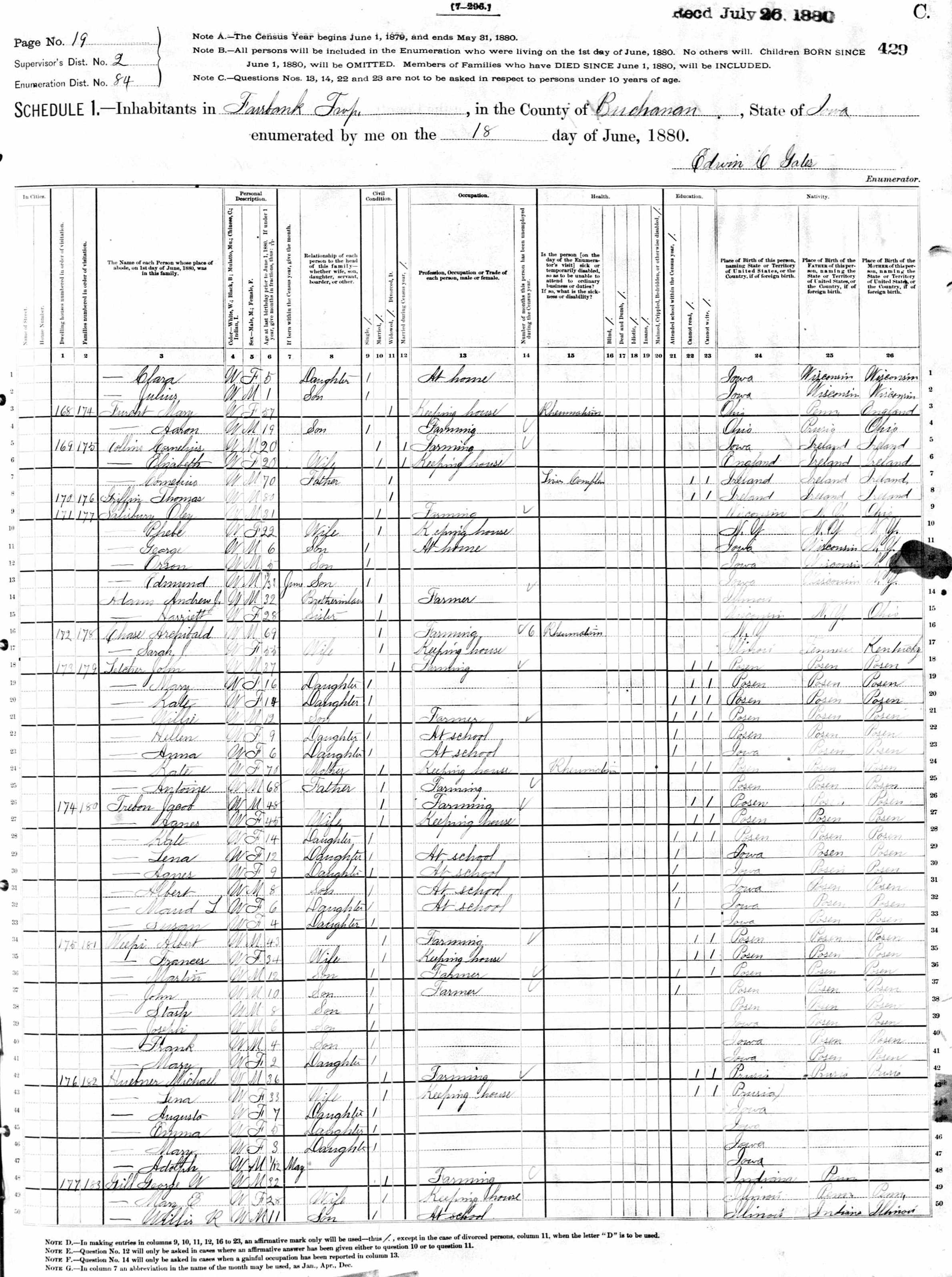 Source: Year: 1880; Census Place: Fairbank, Buchanan, Iowa; Roll: 329; Family History Film: 1254329; Page: 429C; Enumeration District: 84; Image: 0159.