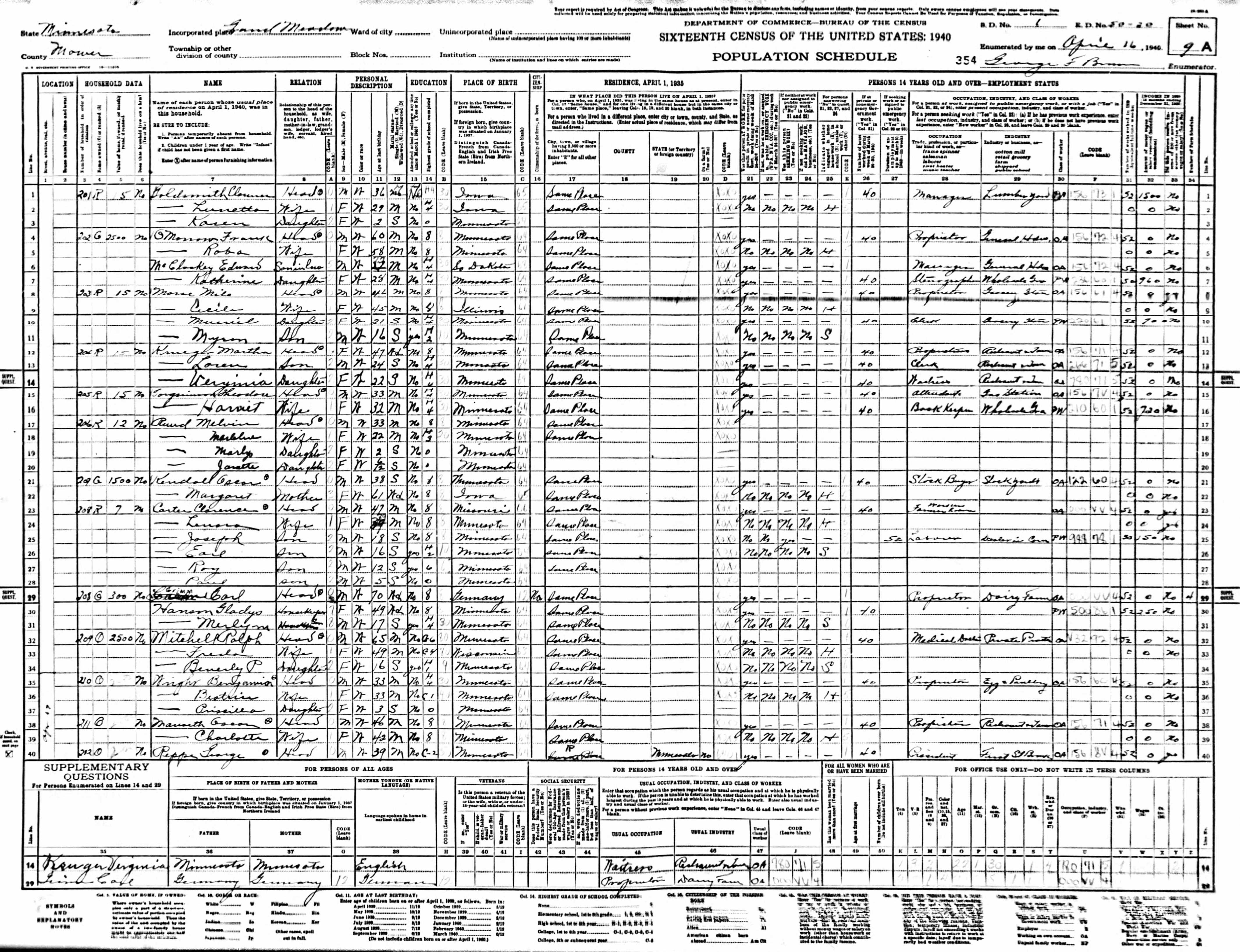 Source: Year: 1940; Census Place: Grand Meadow, Mower, Minnesota; Roll: m-t0627-01940; Page: 9A; Enumeration District: 50-20