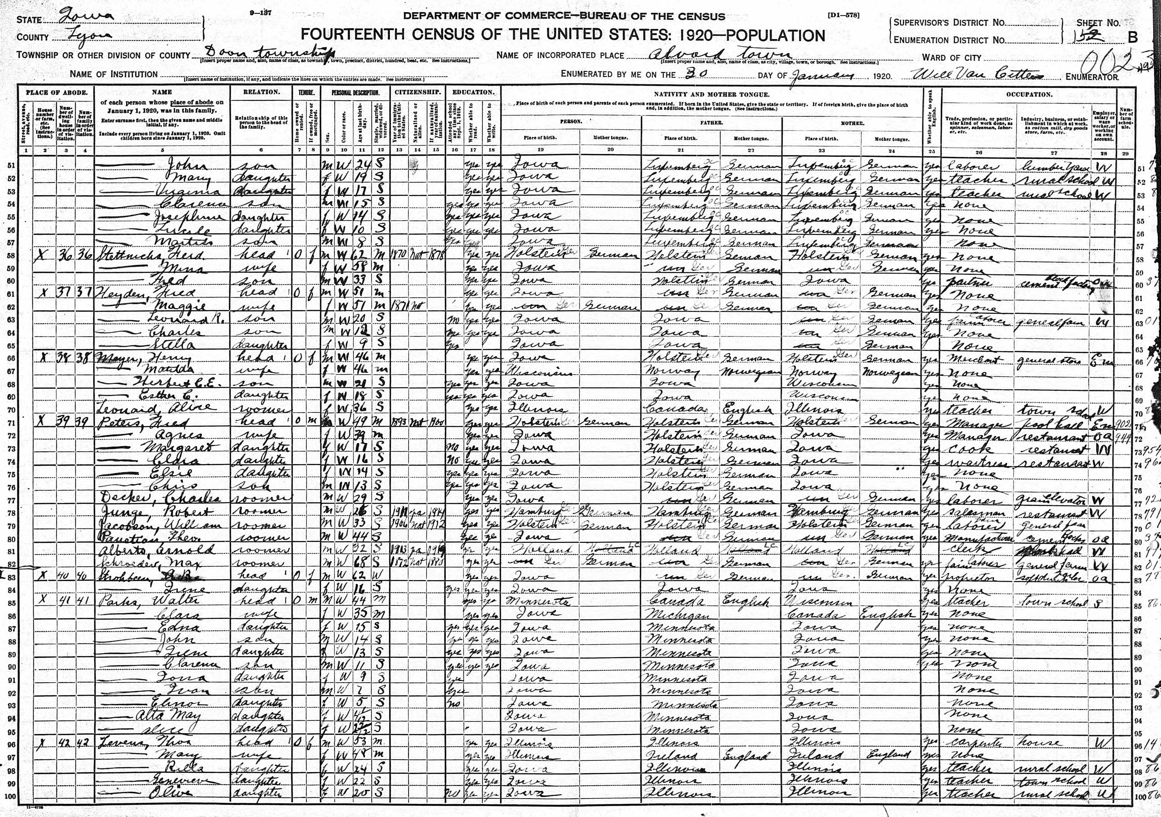 Year: 1920; Census Place: Doon, Lyon, Iowa; Roll: T625_497; Page: 15B; Enumeration District: 70