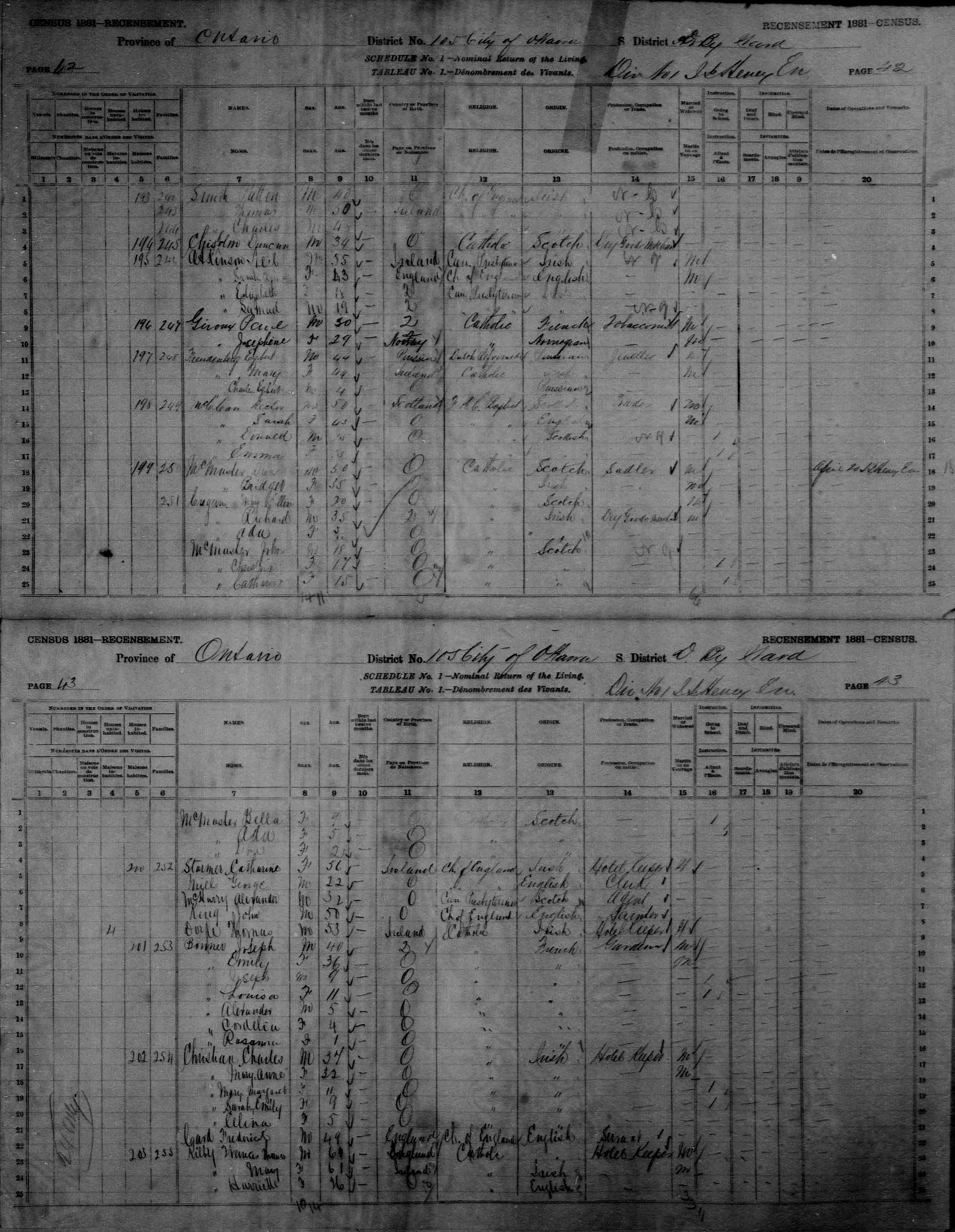 Year: 1881; Census Place: By Ward, Ottawa, Ontario, Canada; Microfilm: C-13230; Page 42 & 43