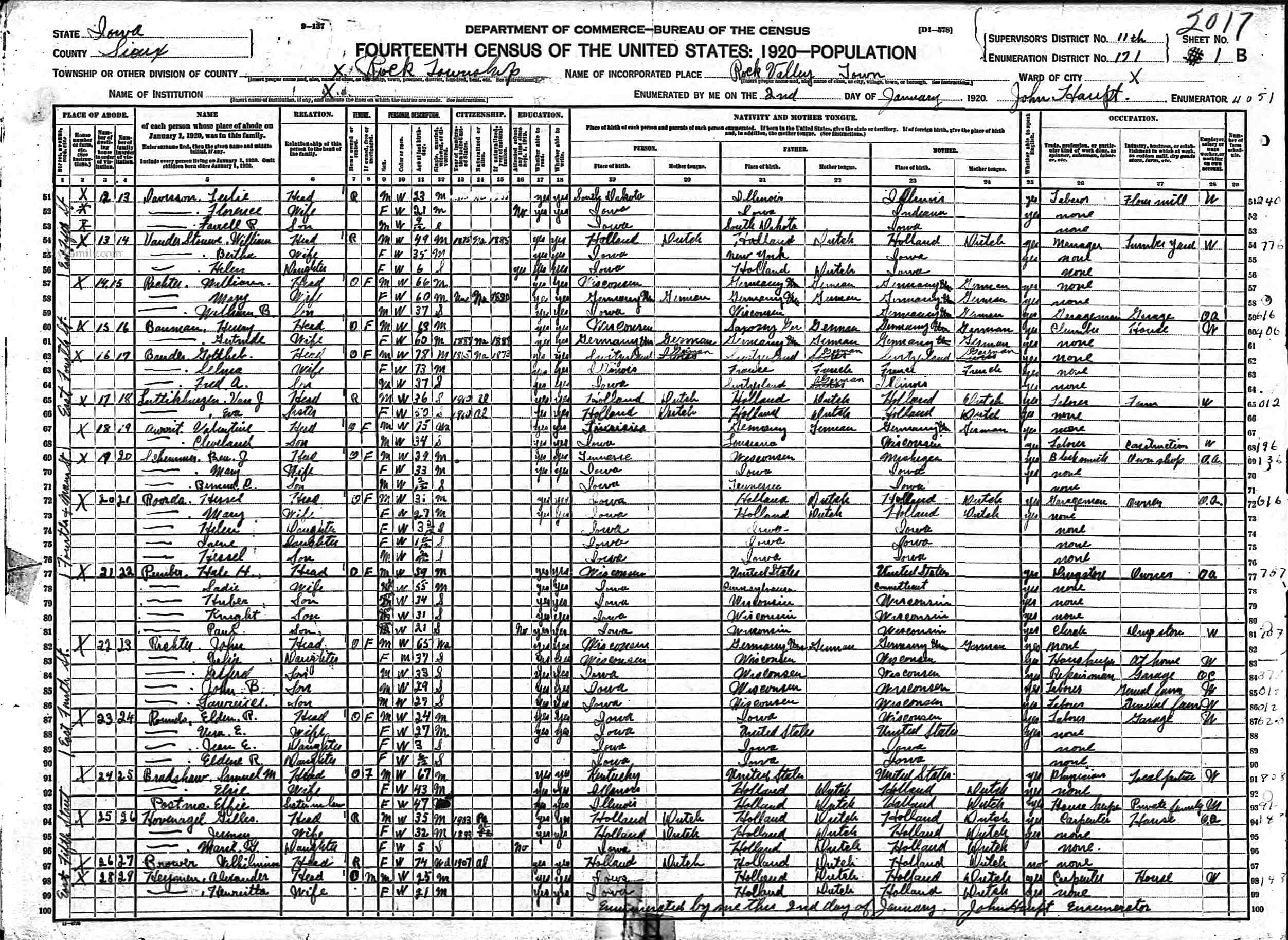 Year: 1920; Census Place: Rock, Sioux, Iowa; Roll: T625_514; Page: 1B; Enumeration District: 171; Image: 983.