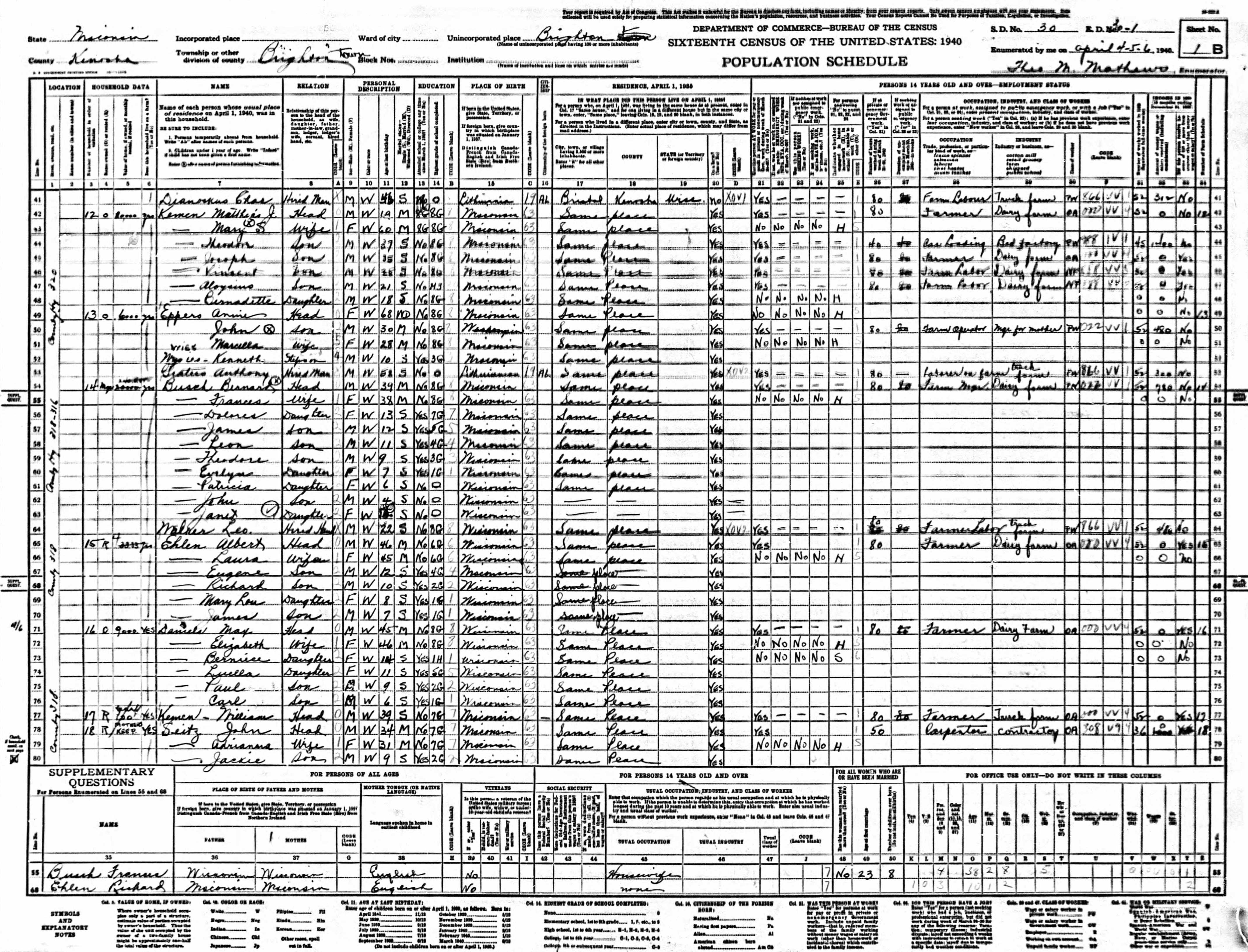 Year: 1940; Census Place: Brighton, Kenosha, Wisconsin; Roll: m-t0627-04487; Page: 1B; Enumeration District: 30-1