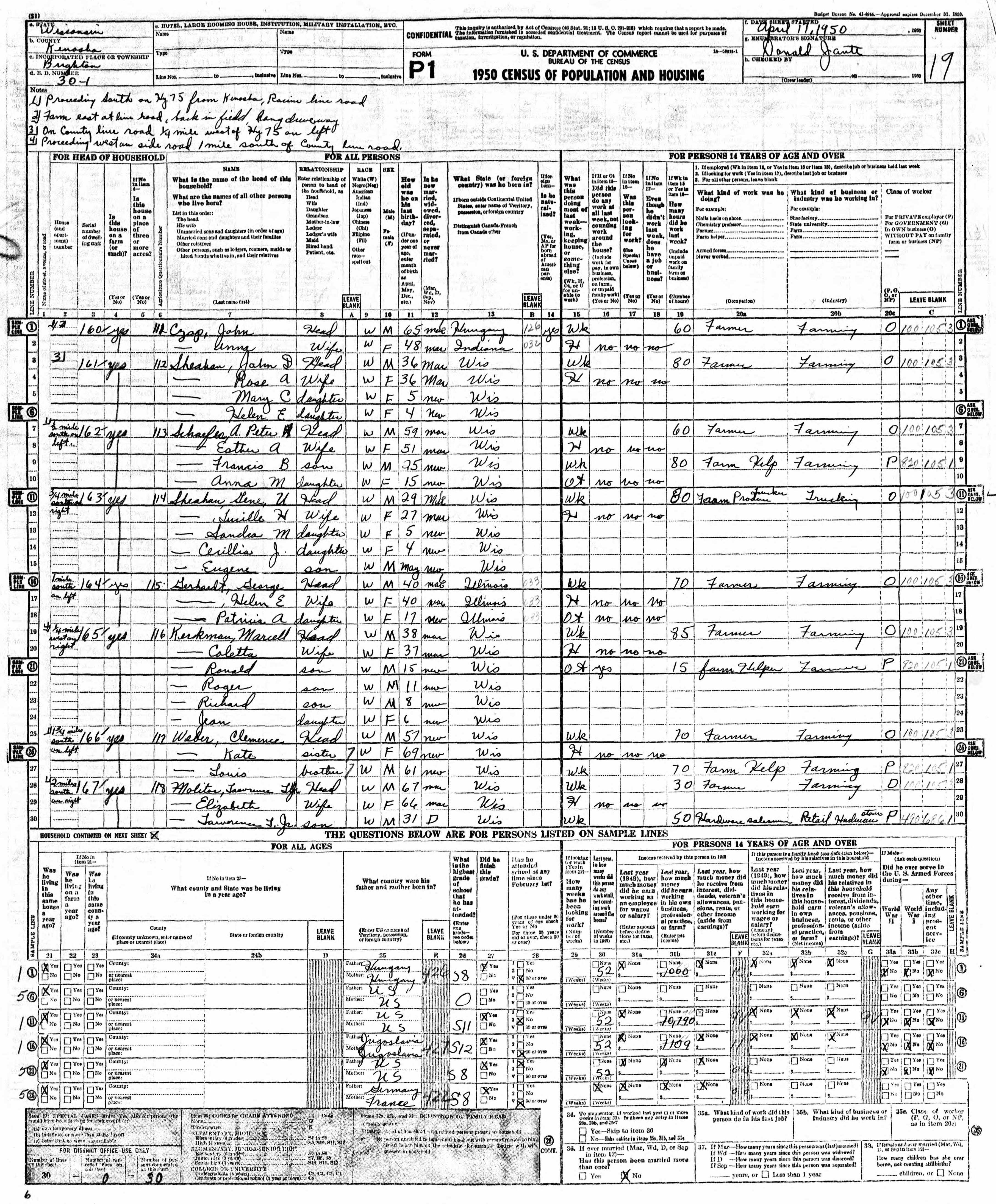 Year: 1950; Census Place: Brighton, Kenosha, Wisconsin; Roll: 3352; Page: 19; Enumeration District: 30-1
