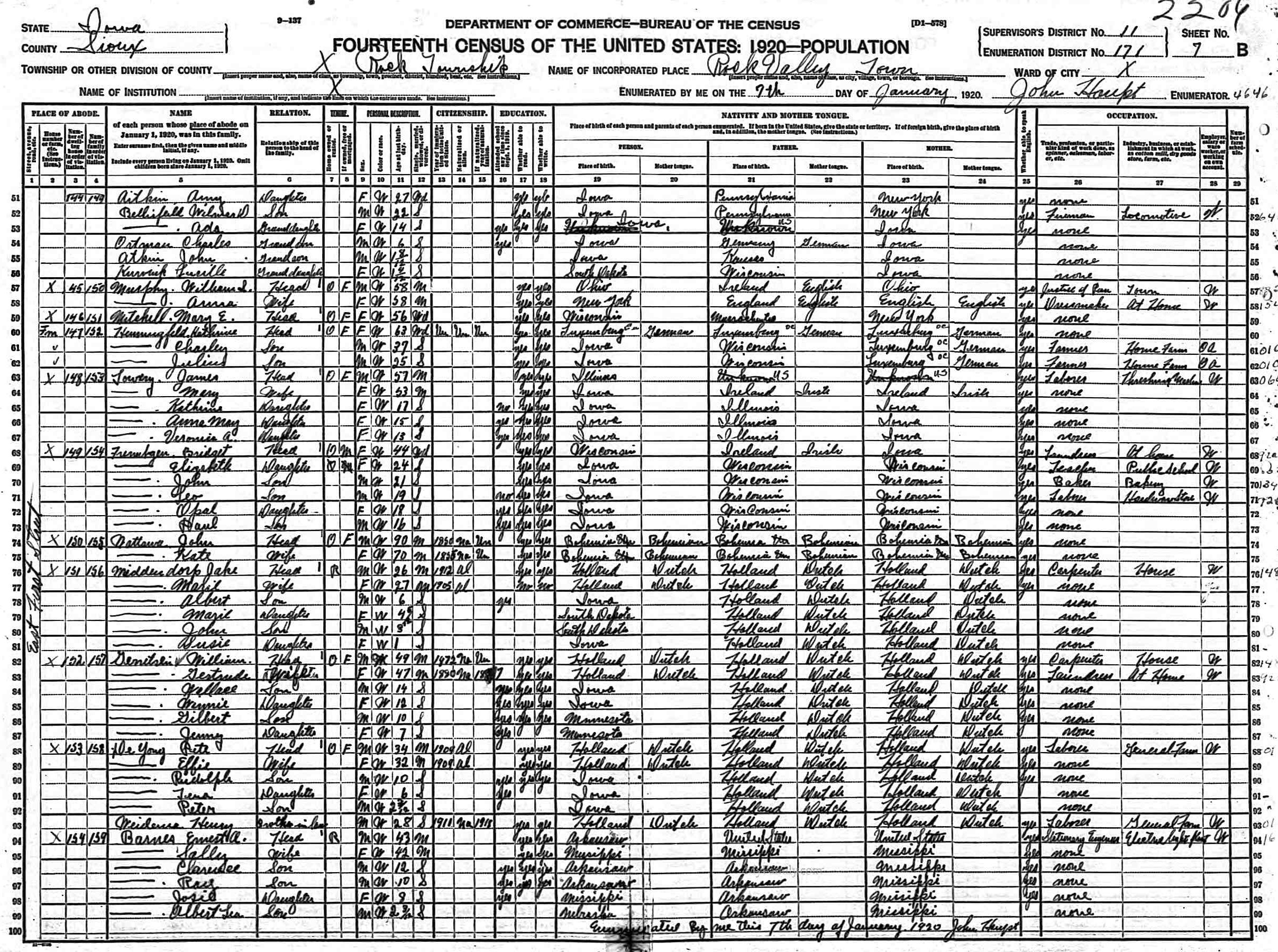 Year: 1920; Census Place: Rock, Sioux, Iowa; Roll: T625_514; Page: 7B; Enumeration District: 171; Image: 995.