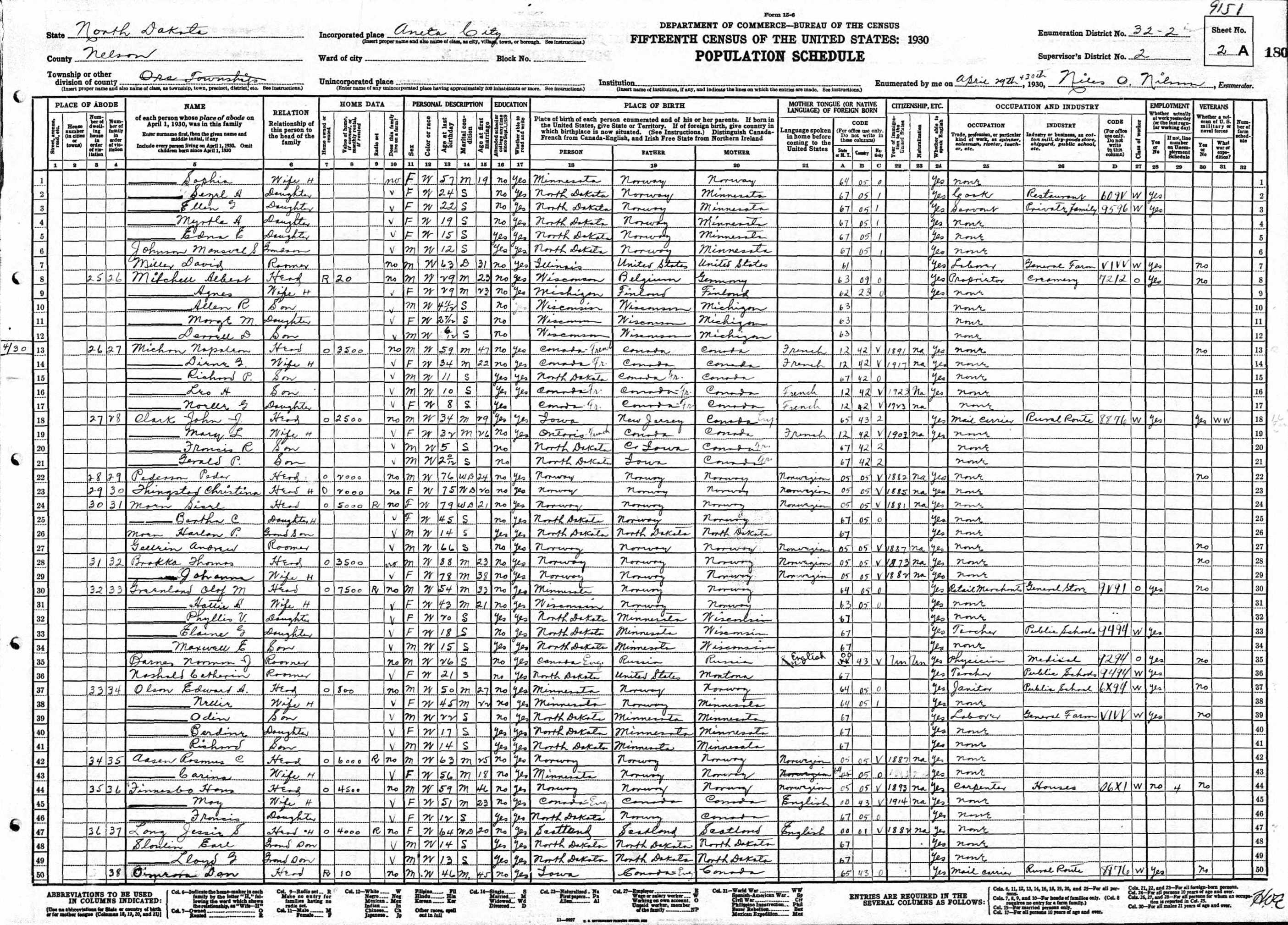Source: Year: 1930; Census Place: Aneta, Nelson, North Dakota; Roll: 1739; Page: 2A; Enumeration District: 0002; Image: 830.0; FHL microfilm: 2341473