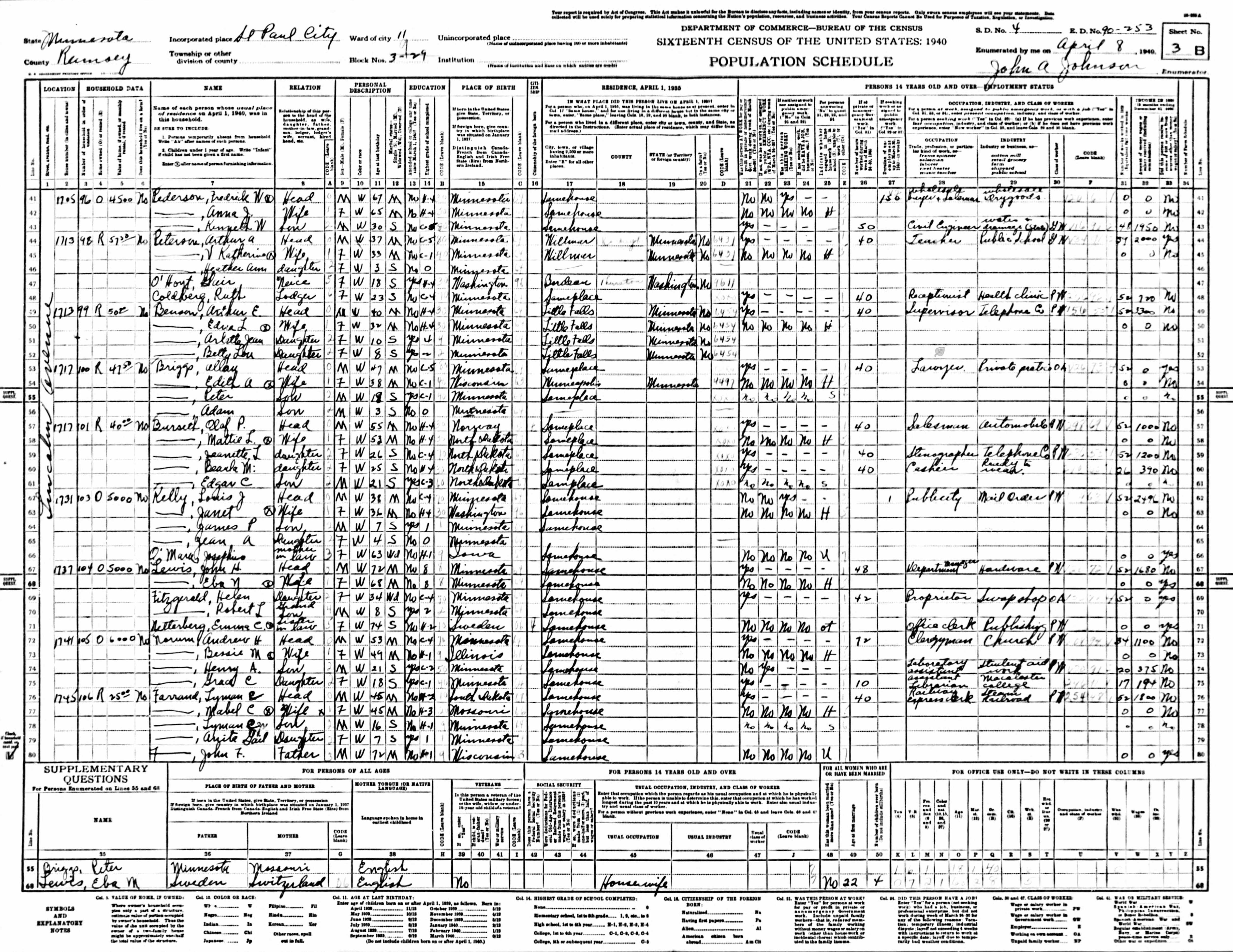 Year: 1940; Census Place: St Paul, Ramsey, Minnesota; Roll: m-t0627-02003; Page: 3B; Enumeration District: 90-253