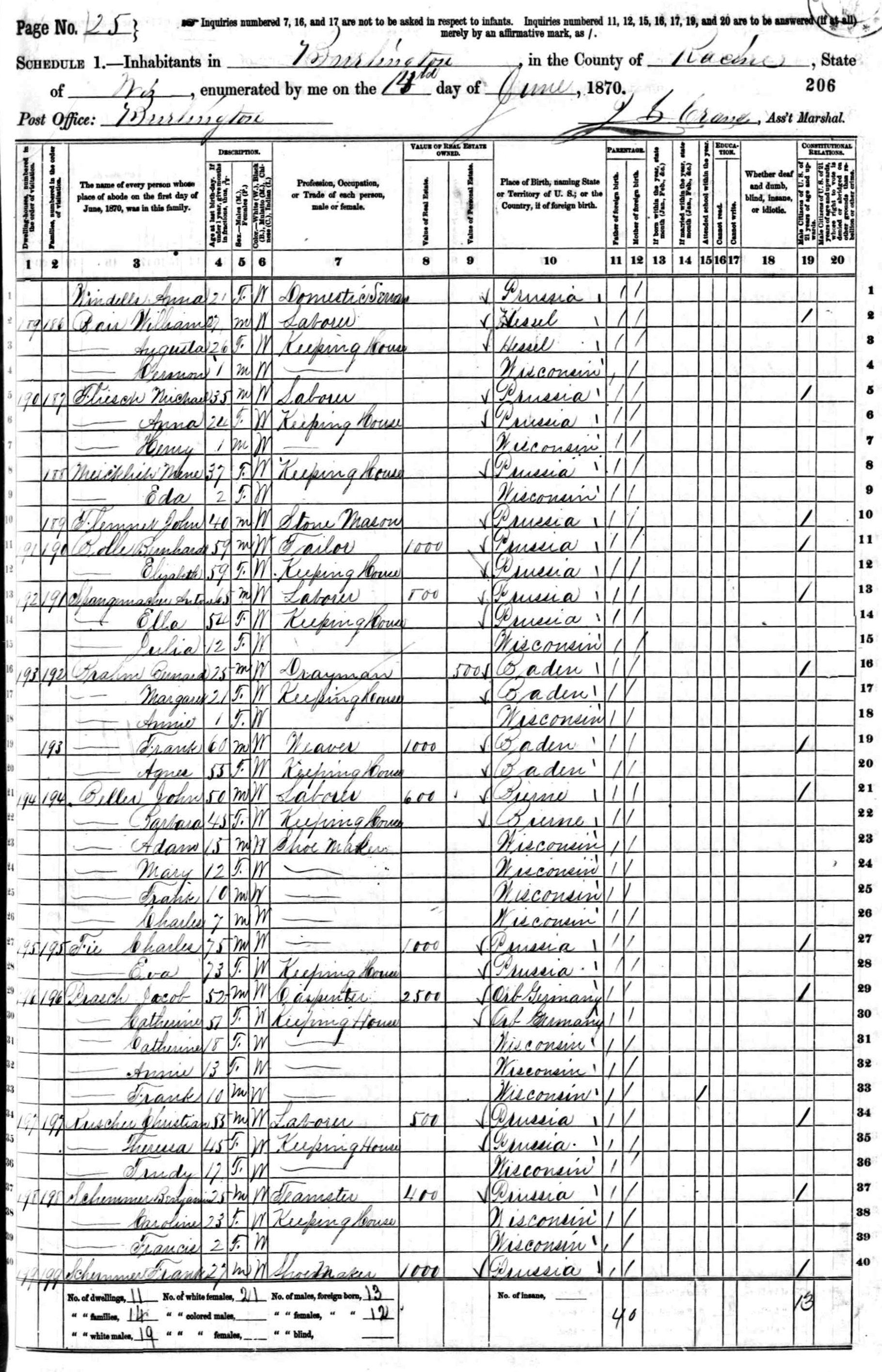 Year: 1870; Census Place: Burlington, Racine, Wisconsin; Roll: M593_1733; Page: 206; Image: 26.